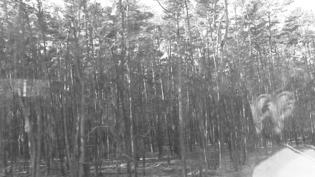 Train Journey (2019, 9:01 minutes, looped) captures the textures of a Polish landscape seen through the window of a local train as it slowly labours through forests and open land. During the first half of the film, colour footage of trees, meadows and signages scrolls past whilst reflections and bits of conversation make us aware of passengers on the train. As the loudspeaker announces the next stop, the train slows down allowing for visual elements to come into focus. Then, unexpectedly, silence as the imagery turns black and white and the footage scrolls backwards.